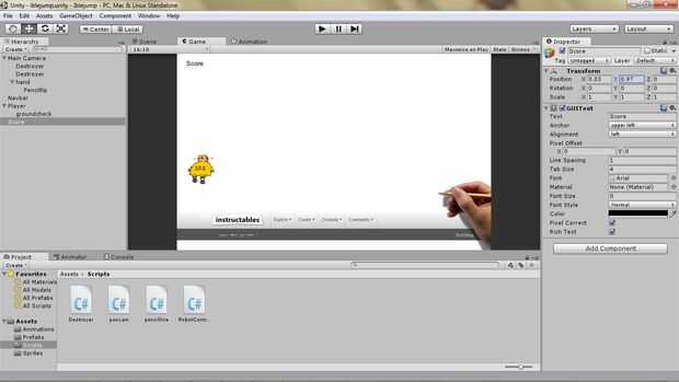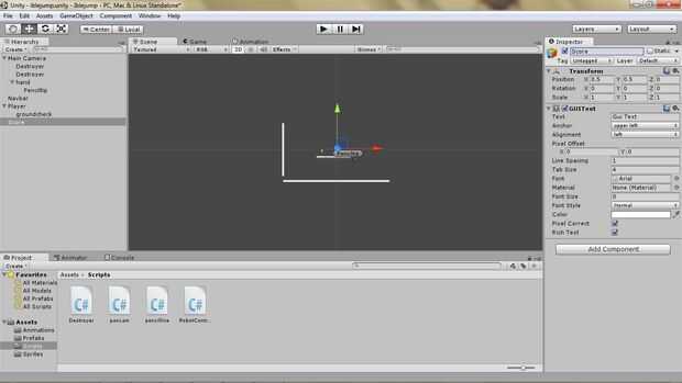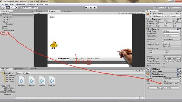 Seleccione la cámara principal otra vez, y verás que hay un nuevo parámetro en el componente de secuencia de comandos en el Inspector de. Arrastre el objeto de puntuación GuiText el parámetro de la interfaz gráfica de usuario.