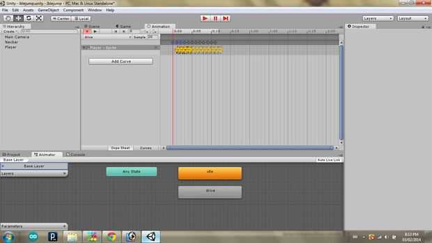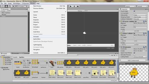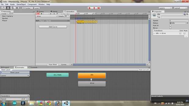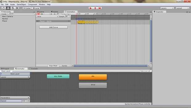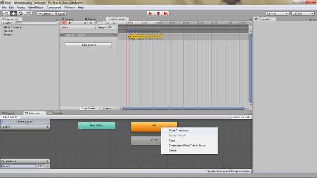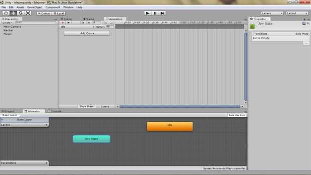Con el reproductor aún seleccionado en la jerarquía, abra la ventana de animación. Puede encontrarse también en el desplegable de ventana. Me gusta mina del muelle en la misma zona que mi escena y juego windows.