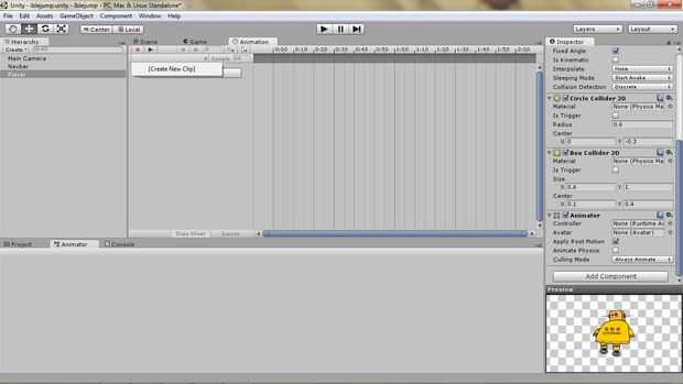En la ventana de animación, haga clic en los triángulos pequeños pequeños al lado de "muestra" para crear un nuevo clip.