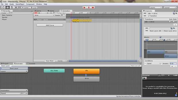Ahora haga clic derecho en el estado inactivo y seleccione "hacer la transición". Entonces arrastre a su estado. Esto debería hacer una pequeña barra de flecha. Seleccione el triángulo en el centro de la barra de la transición. Cambiar la condición de transición en el inspector cuando la velocidad es mayor que 0.01. Ahora crear una transición de nuevo en coche a ralentí con la condición de que la velocidad es menor que 0,01.