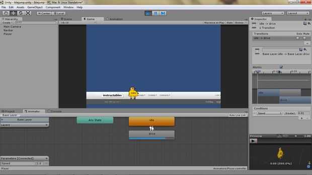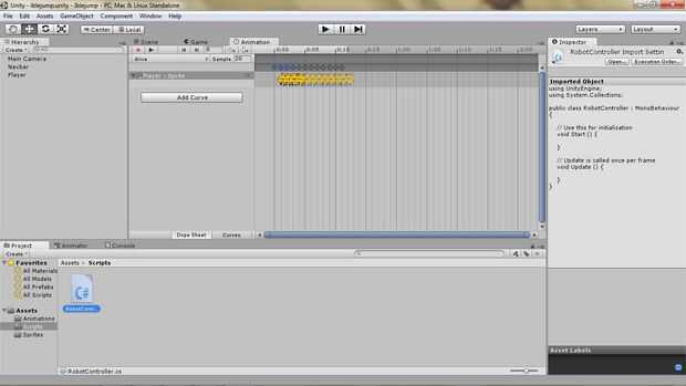 Guarde la secuencia de comandos y volver a la ventana de la unidad. Arrastre el nuevo script de RobotController de trabajo del proyecto están en el objeto del jugador en la ventana de jerarquía. Pulse el botón de play para ejecutar el juego y usted debe ser capaz de controlar el robot con las flechas izquierda y derecha. Si abres la ventana de animación debajo del juego, verás la animación cambiando Estados de coche a ralentí dependiendo de si o no el Robot se mueve.