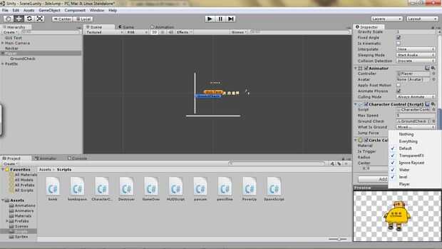 Volver otra vez a la secuencia de comandos de controlador de Robot en el Inspector y asegúrese de que establecer lo que es tierra en todo excepto el jugador. Seleccionar todo, luego vuelva a abrir el cuadro de diálogo y anule la selección de jugador. (Gracias c0)