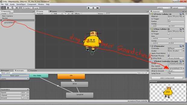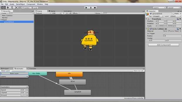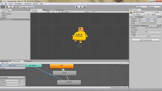 Arrastre el nuevo Colisionador en el objeto del jugador en la ventana de jerarquía. Cambiar el radio del Colisionador de groundcheck a 0.1 y cambiar su posición de transformación y-1. Esto pone un poco círculo pequeño justo debajo de los pies de Robots. También etiquetado como jugador y en la capa de jugador.