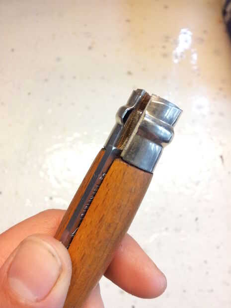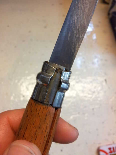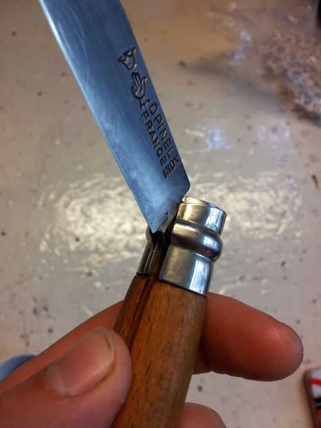 inventada por Marcel Opinel en 1955, el anillo de seguridad Virobloc mejoró en el año 2000 en todas las gamas de Opinel. Desde ese año es posible bloquear la hoja en posición cerrada (seguridad de transporte). Si tienes un cuchillo de Opinel pre-2000, este instructable le mostrará cómo ajustar el anillo de tal forma que la hoja puede bloquearse cuando se cierra la cuchilla. Sólo se tarda 5 minutos. Necesitará una sierra de hierro y una mordaza de mesa.