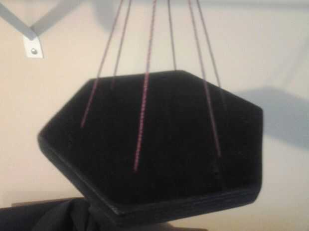 Un nudo en un extremo y rosca la cadena a través de la pieza superior de la madera y también a través de la esquina opuesta y haga un nudo para sujetarla. (ver imagen) Repita para las otras dos cadenas.