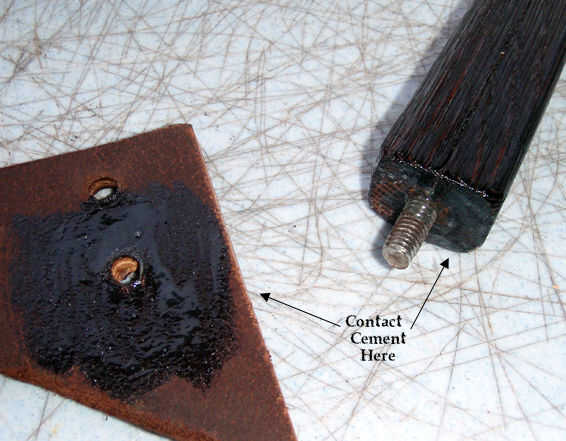 Poner algún cemento de contacto en un retal de latigo y en la parte inferior de la espiga. Cuando secos ponen juntos y ajuste para adaptarse. Esto hace que una arandela de cuero agradable que asegura un ajuste perfecto cuando se rosca en la tuerca de t.