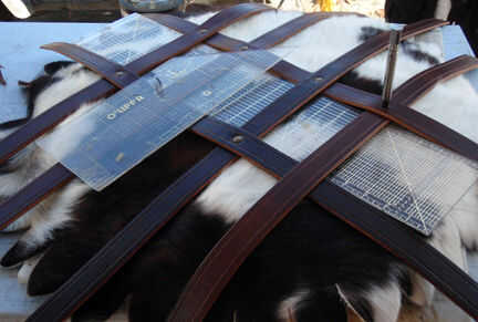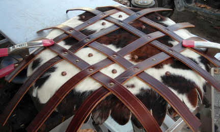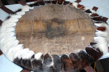 Remache la red latigo abajo.  Colocar y clavar clavos decorativos o conchos.  Frente entero de la capa de la tapa del barril con cola titebond 3. Encontrar el centro del cuero y tapa de barril emparejarlos y dejar boca abajo esta seco varias horas o durante la noche del tirón.  En el parte posterior uso cemento de contacto en ambos los pétalos de piel de la vaca y el cañón, deje secar y saque enseñó.