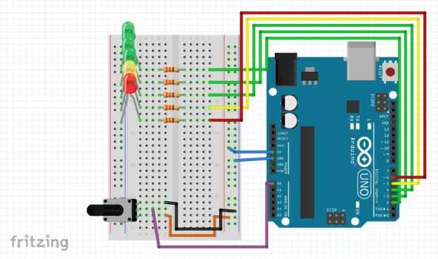 Guíese por la imagen (yo uso pins 2-6 LEDs y A0 para potenciómetro y el mismo uso en el código para cambiar si es necesario)