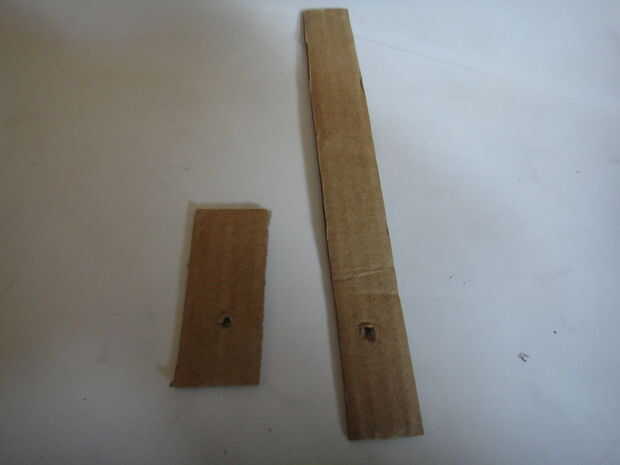 Ahora toma un trozo de cartón 3 por 1 pulgadas y hacer un agujero de casi 1 cm del extremo del. Luego tomar la 7 por 5 pulgadas de cartón y hacer un agujero 2 cm del extremo del.