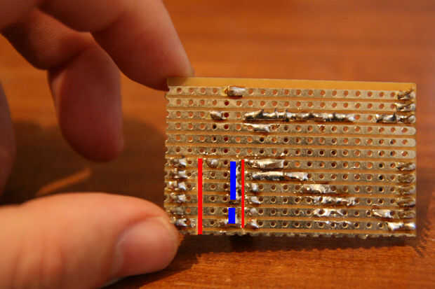 En la parte inferior debemos cortar y combinar algunas conexiones. Ver la foto para obtener más información. (rojo = corte, azul = combinar)