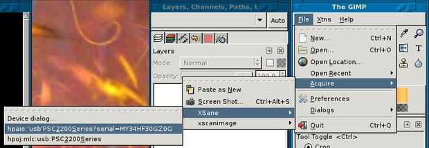 Los usuarios de Linux: desde la ventana principal de GIMP, abrir el menú "Archivo" y ampliar "Adquirir...", luego expandir "XSane". Allí puede tener uno o dos anuncios para el escáner. Si usted tiene uno, selecciónelo. Si tienes más de uno, seleccione la que se ve mejor. Si resulta que no para trabajar, utilice otro.