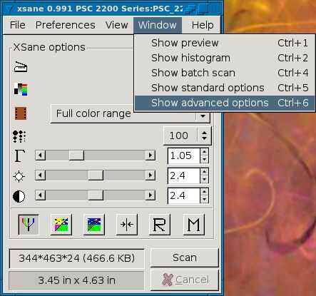 Los usuarios de Linux: activar las preferencias avanzadas y la ventana de previsualización del menú de ventana de XSane. En las opciones avanzadas, usted puede notar que la compresión se establece en JPEG. Cambiar a "Ninguno". No queremos compresión por ahora, el software de gráficos harán más tarde. Queremos datos sin procesar.