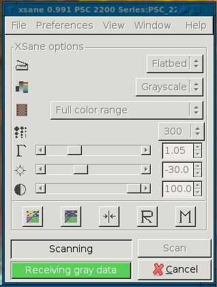 Al empezar a XSane, generalmente asume que desea escanear una imagen en color. Enseguida de esta noción desengañar y seleccionar "Escala de grises". La ventana cambiará para mostrar sólo las opciones que necesita. En este momento realmente no sé qué opciones necesita todavía, pero aquí están algunos pensamientos, basados en la experiencia. Sí, hay una opción "lineart" en XSane pero no le permite controlar el contraste de su exploración. Se asume que el punto que va a escanear es perfectamente blanco y negro. Aunque el dibujo puede parecer así a ojo, no es. Vamos a utilizar GIMP para convertir la imagen a blanco y negro puro pronto.
