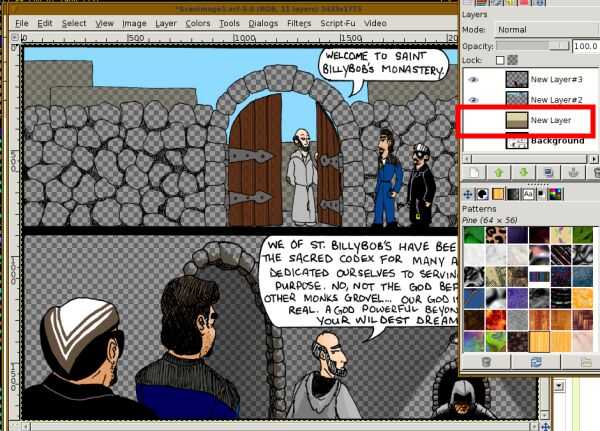 Mi primer paso es seleccionar la capa de fondo y crear unas nuevas capas de transparentes encima (de colores, burbujas de palabra, etc.). En la más baja capa transparente, voy a seleccionar un marco cómico todo y cubo relleno el color de fondo más importantes, en este caso una tonalidad de marrón para las paredes. El segundo marco obtiene un tono más oscuro de marrón. Luego apagar esa capa y pasar a la siguiente capa a color mis personajes principales en. Lo necesito para abrir un comic más para seleccionar los colores adecuados para los pisos. Usando más viejos comics asegura que los colores son consistentes.