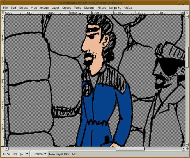 Selecciono la herramienta de cuentagotas, también conocido como "Color Picker Tool" y elegir un color de primer plano y el fondo de la imagen antigua (en este caso, un azul para la ropa y el tono de piel para el carácter en el mono, en medio de los tres). Con la herramienta lápiz (bordes duros), dibujaré de colores en el interior los bordes de los contornos. Para áreas más pequeñas (como las áreas de la piel en la imagen) voy sólo colorearlos. Para áreas más grandes, (como el traje de agente del dril de algodón) voy sólo esbozar los contornos, luego utilice la herramienta de cubo de relleno para rellenar las áreas vacías. Recuerde que trabajar en la nueva capa transparente - esto le impedirá basándose en sus líneas.