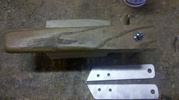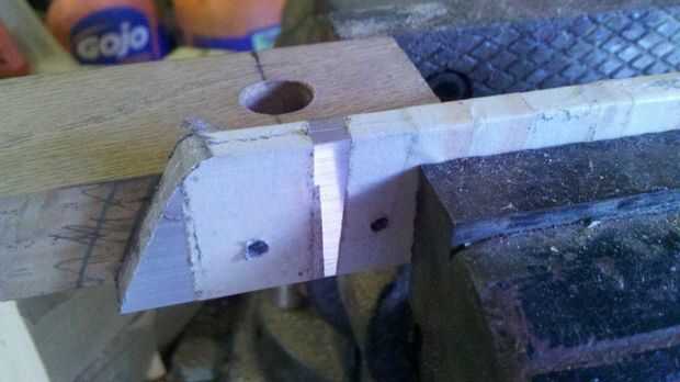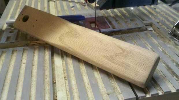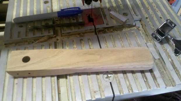 He aprovechado el buje en solo un poco y utiliza la clavija de afinación como plantilla para perforar los agujeros piloto poco cuatro que sujete la clavija de ajuste en su lugar cuando los tornillos se ponen en. Quite todo el hardware y empezar a presentar, dar forma y lijado del mango hasta que se ve como cool como la mía. En retrospectiva, creo hubiera redondeado la empuñadura un poco más y utilizar paracord como un abrigo de mango, pero tal vez que será un proyecto paralelo por la carretera. También lo había manchado y ponerlo a un lado para el posterior montaje.