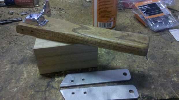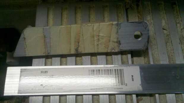 Ahora para las barras de la manija. Yo corte dos piezas de aluminio plano stock bar aproximadamente 5 pulgadas de largo. Creo que la clave de esta parte es grabarlos juntos por lo que son exactamente lo mismo. Cortado un extremo que estén al ras y el otro extremo en un ángulo de 45 grados aprox. para hacer una longitud de 4 3/4 pulgadas de largo. Si el tuyo tiene una longitud diferente estará bien así como son el mismo, cinta de enmascarar es nuestro buen amigo. Mantenerlos juntos y perfore un orificio de 1/4" en 1/4 roscado barra sostiene la rueda puente y manejar juntos y luego taladre unos orificios para el tornillo utilizado para sostener las barras de la manija del metal en la manija de madera. Otra vez, mantenerlas pegadas juntas por lo que son lo mismo. El primer orificio debe ser 3 1/4" plano final y la segunda 4" del extremo. Como son lo mismo, no creo que se va a importar mucho.