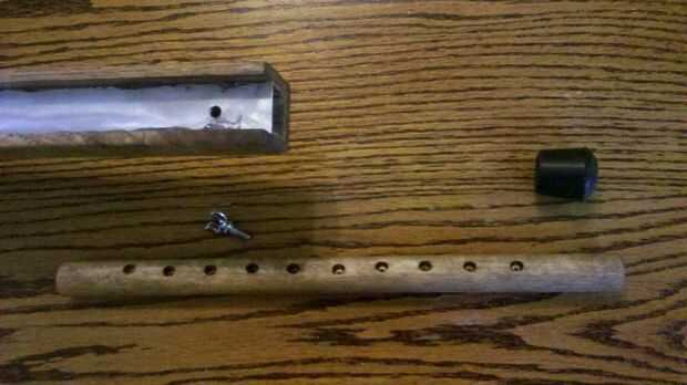 El agujero en el lado de conector de sonido poco 31" hacia abajo desde la parte superior es una pena porque realmente dos agujeros. La madera gruesa de 1/4 del lado es demasiado gruesa para poner la tuerca. Así que primero perforé un orificio de 1/4", entonces para hacer espacio para instalar la tuerca perforé un agujero de 1/2 dejando suficiente madera (aprox. 3/16") para poder poner la tuerca en y asegurar la toma de audio pequeño al lado. Otra vez, recomiendo intentarlo hacia fuera en un pedazo de madera 1/4 primero en un esfuerzo por eliminar los hoyos de práctica en el futuro de los Güelfos.