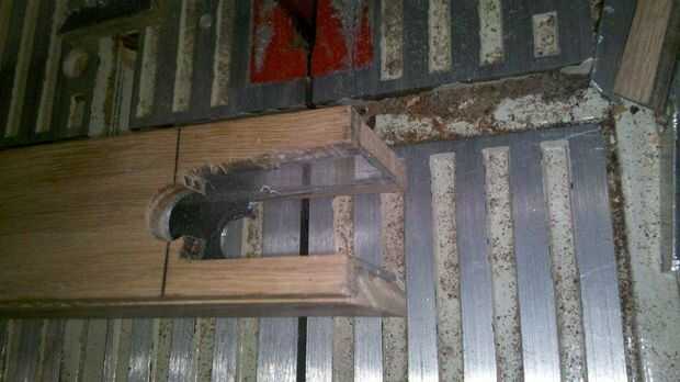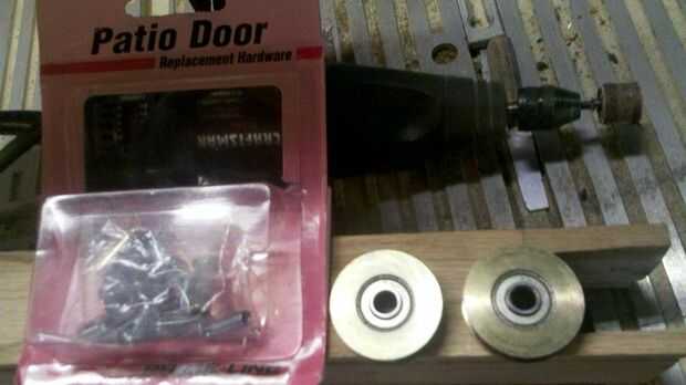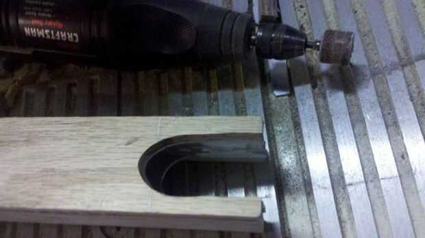 Primero necesitamos una muesca donde va la rueda de la tuerca superior. Perforé un orificio de 1/2" abajo de la cara y 1 1/2" de la parte superior. Luego con una sierra, o en mi caso una banda de sierra, cortar desde la parte superior hasta el agujero para hacer una muesca de forma oval medio muy crudo para la rueda. Usando una herramienta giratoria y varios pedacitos, he intentado mi mejor para limpiarlo y sacar la madera y el aluminio por lo que quedaron solamente los lados.