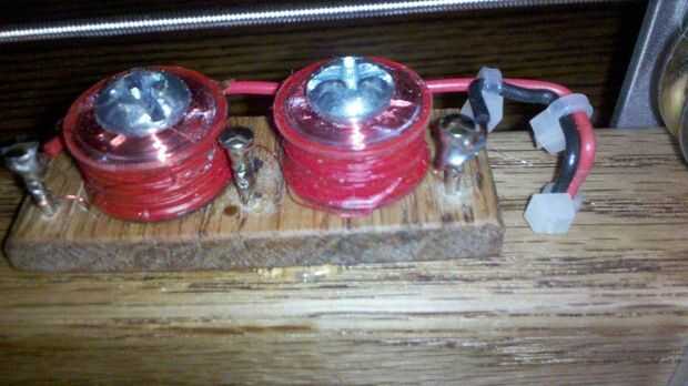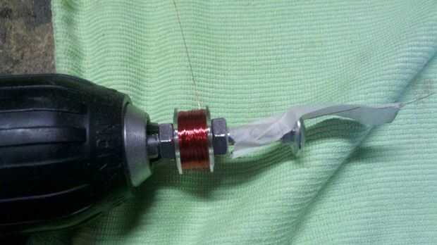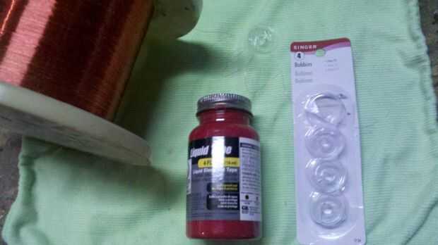 Tenemos dos bobinas. Puse el plástico coser bobinas en un perno y había montado en mi taladro. El carrete fue apuntalado en un taco de giro gratis donde guiar el cable con una mano y funcionar el taladro con el otro. Algunos contará el número de bobinas en cada bobina al mismo tiempo que la bobina pero simplemente llenar la canilla y deje suficiente espacio para untar una capa de aislante rojo para mantener las bobinas juntas y evitar que las vibraciones. El truco de mi método es dejar una traílla larga agradable para el interior de la bobina y con cinta de enmascarar para mantener el plomo fuera del camino durante la precisión de proceso de la bobina. Hacer dos rollos y poner una capa de aislamiento líquido.