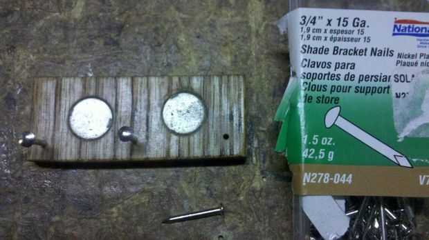La base es un trozo de roble 2 1/2" de largo y 1" de ancho. Perfore dos orificios de 1/2" para los imanes. Taladre tres orificios pequeños para los tres clavos pequeños. Solía uñas de color niquelado como terminales de la soldadura de los cables. Colocar dos imanes en cada agujero y pegar de la parte inferior para la parte superior de los imanes están al ras con la parte superior de la base. La pila de imanes en cada orificio deben ser de polaridad opuesta. Para asegurar esto, apilados los cuatro encima de la otra, luego coloqué dos en el primer agujero y sacado con pala encima de los dos restantes, les volcó y despertó algunos epoxy.
