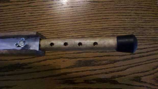 Si ya perforado el agujero de la tuerca de mariposa y ensarta, la parte más difícil de la patas Whamola es completa. La pierna es una longitud de 13" de 7/8" pasador de madera. A partir de la izquierda en 1 3/4", taladré 10 agujeros 1/8" pulgadas de profundidad y 1" aparte por lo que ajustará. Me lo había manchado y había pegado a los pies de goma en el extremo.