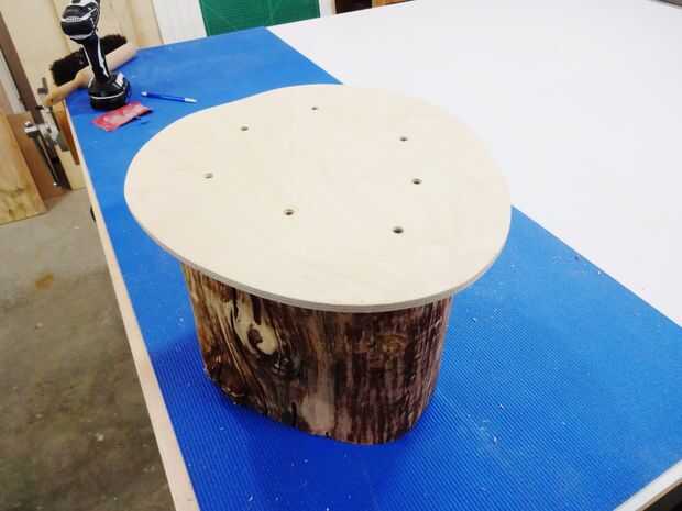Una pequeña placa base fue hecha de una pieza de madera de desecho que se atornilla a la parte inferior del tronco.