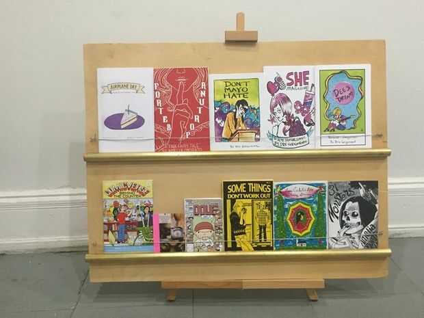 Tienes tu zine rack! Puede ser colocado en un caballete de mesa para espectáculos (como en la foto) o apoyada contra la pared de la biblioteca del zine para mostrar algunas joyas.