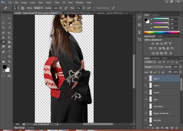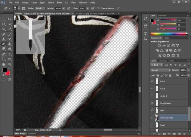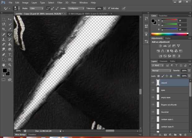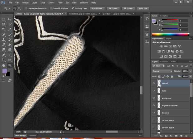 Esto crea la herida, el pincel representa los bordes rotos de la tela.