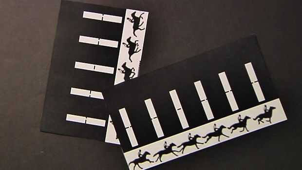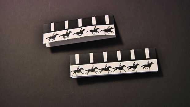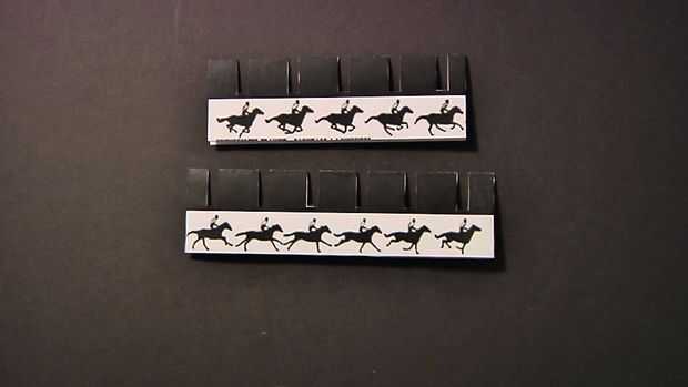 Cortar dos tiras de la plantilla de Zoetrope. Doble las dos tiras a lo largo de las líneas discontinuas. Corte cada uno de los rectángulos blancos de ambas bandas para crear a las rendijas de visión.  Utilizar bucles de cinta para unir las hojas plegadas.