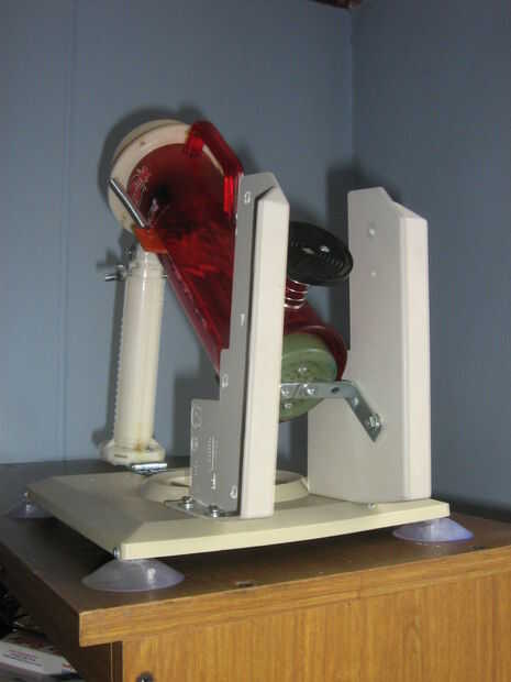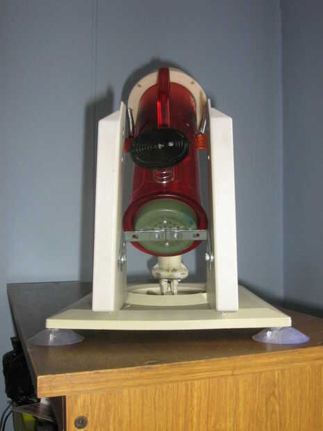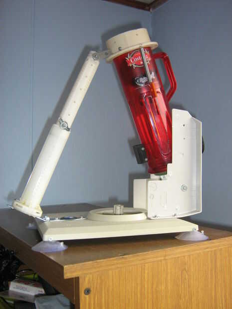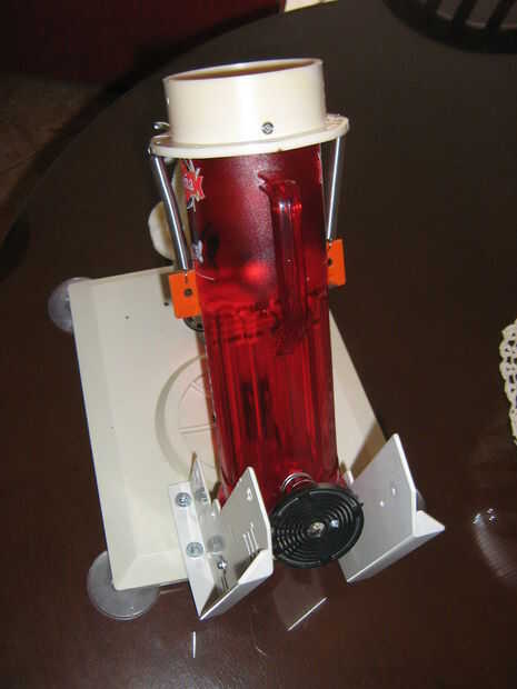 Tuve sólo una noche para construir una máquina capaz de lanzar una pelota anti-stress, con altura ajustable. Así que combiné un tarro de cerveza de plástico (material de una cerveza colombiana llamada "Costeña" de marketing), un árbol de aseo para la elevación y otras cosas para el marco. Trabaja con dos muelles, como algún tipo de tirachinas. Cargar el mortero, bloquear el gatillo, oprima el gatillo y lanzar la pelota.