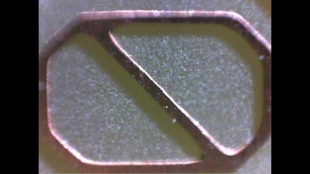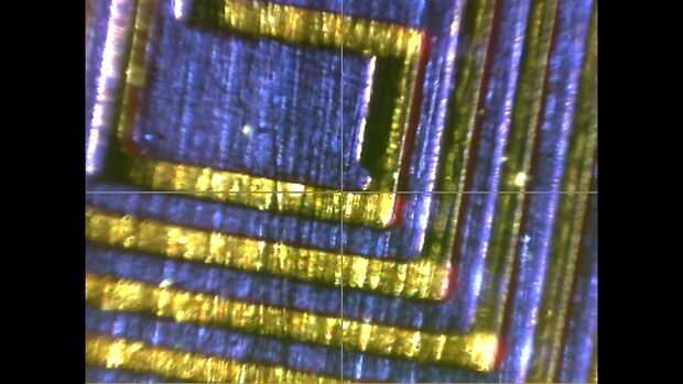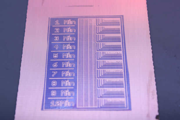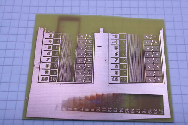 El primer diseño de Junta de calibración que hice fue una disposición rápida y sucia que hice sin pensar demasiado sobre ello. Pero yo quería saber lo que mi nuevo exposer era capaz de, así que hice uno mejor, esta vez con cuatro grupos de vertical traza, 7,6,5 y 4 mil con espacios de acuerdo. Observe que la resolución 5/5mil anunciada era del pensar original y diseño chapucero, que tiene una cuadrícula de colimación. Como muestran las fotos, esta red parece no ser necesario para lograr 5/5mil.