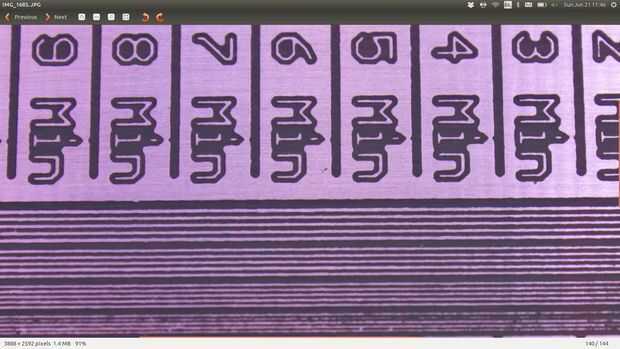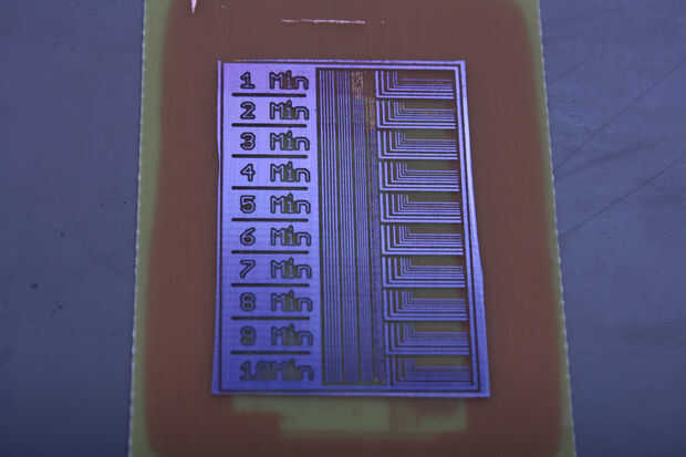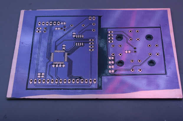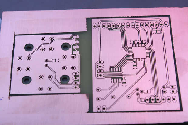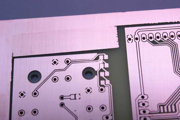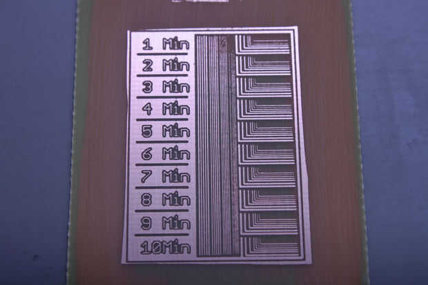 Hice otra calibración diseño, que había expuesto en la película, una vez por todas saber lo que es. Bueno, ahora sé. Incluso con ilustraciones fotográficas reales 5/5 mil es lo mejor que es prácticamente posible. 4/4mil funciona, pero a ese nivel importa cada partícula de suciedad y mi laboratorio casero no está suficientemente limpia. No es como generalmente utilizo nada menor de 10mil de todos modos (excepto para ciertas huellas, obviamente), aun cuando tengo mis tableros hechos en una fábrica.