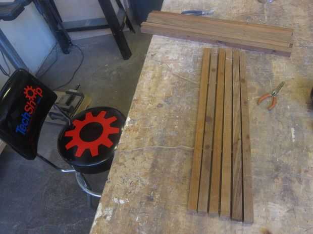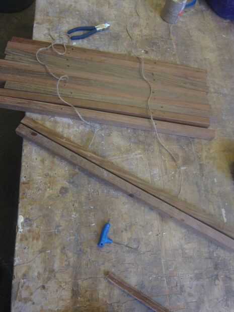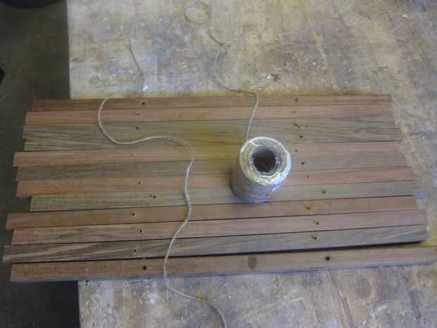 Un nudo en el extremo de un pedazo de guita, Enhebre el extremo desatado el primer listón con una llave hexagonal para ayudar en el camino. Tensar la cuerda, atar un nudo y cincha abajo contra el lado de la madera. Repita para el otro trozo de hilo. Luego hacer el todo poke-guita-por-minúsculo-agujero, tensar, atar una cosa nudo una y otra vez hasta que te quedas sin madera. Recortar la cuerda después de todo, se ata juntos.