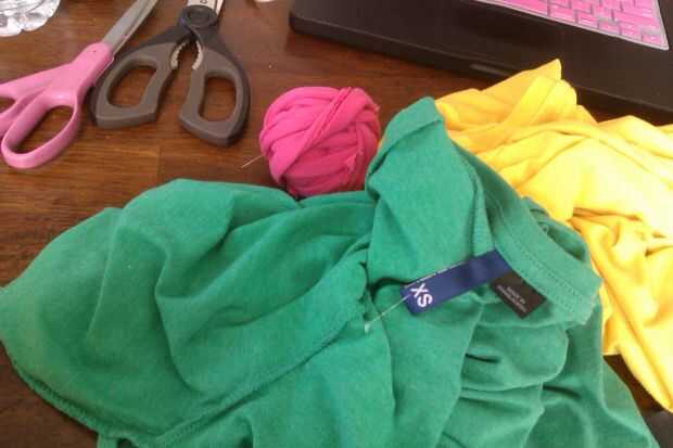 Usted debe terminar con una tira muy larga de tela de su camiseta. Estiramiento esto realmente, realmente bien y enróllelo para arriba en una bola por lo que es más manejable. Repita para sus otras camisas.