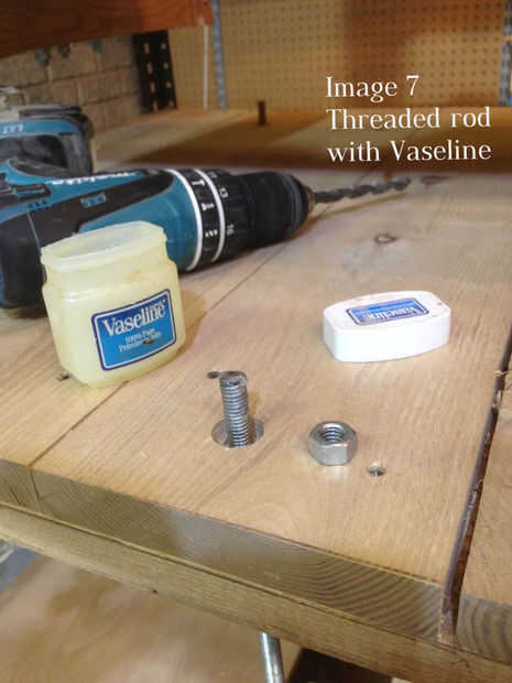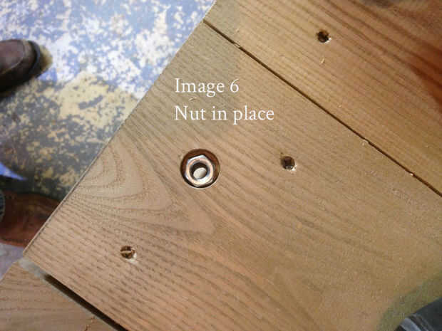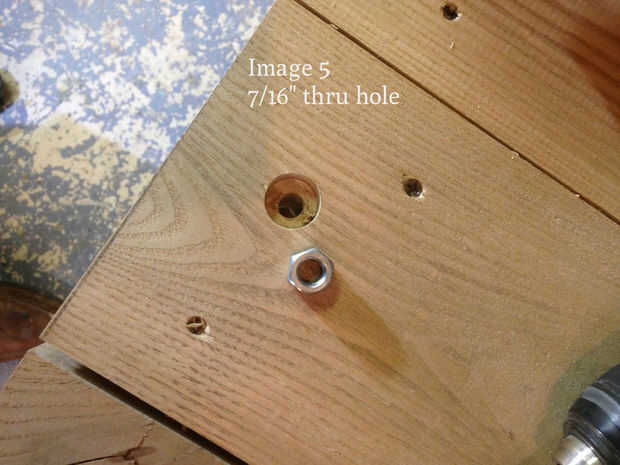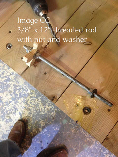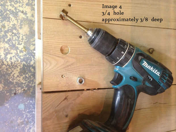 - Usando un 3/4" Fostner o una azada de broca, perfore un agujero ~3/8" profundo (imagen 4) - Asegúrese de que una de las tuercas para la varilla de 3/8" rosca encaja en el orificio al ras con la parte superior de la cubierta. ¡ No taladre la manera entera a través de la cubierta con esta broca!