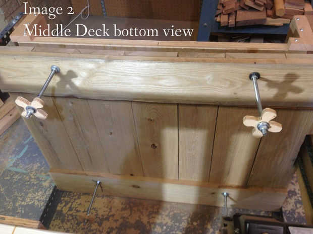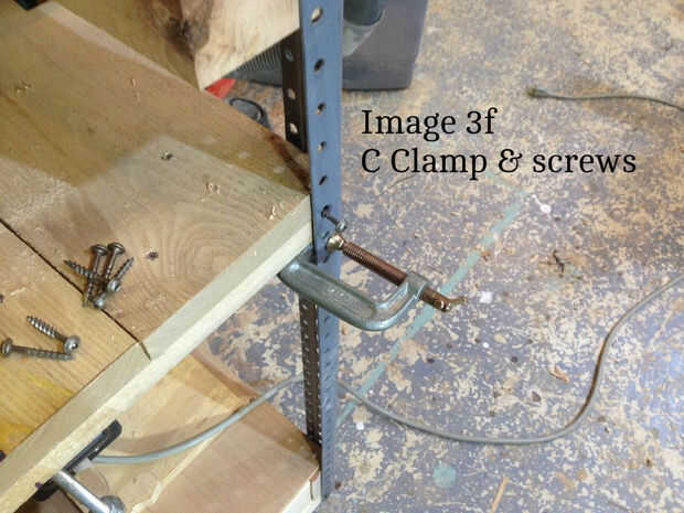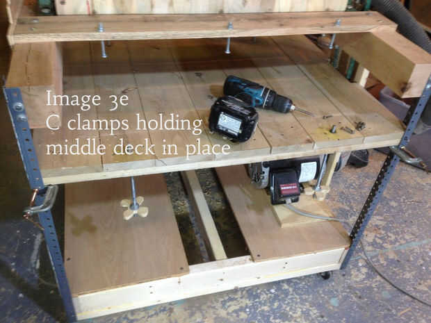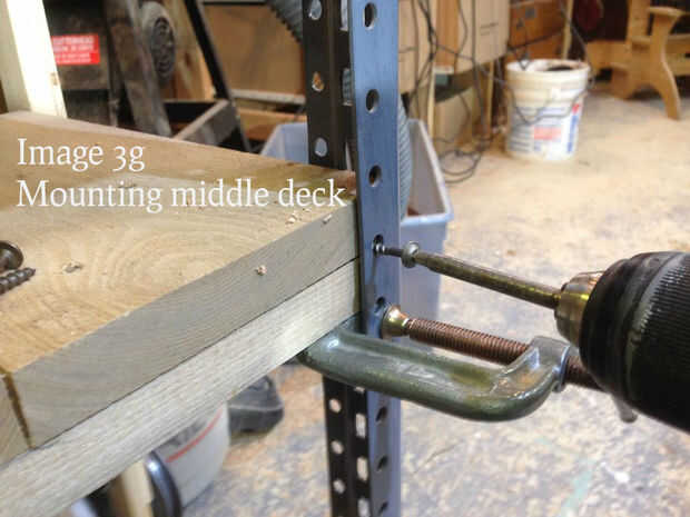 - A continuación montamos la cubierta central. Usé algunas abrazaderas de tipo C en el ángulo de hierro para soportar la cubierta media (ver imágenes 3d, e, f, g) hasta que tenía todo en su lugar y estaba listo para atornillar firmemente.