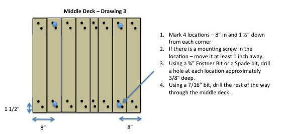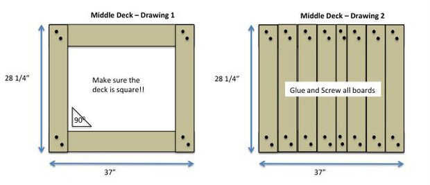 - Haciendo referencia a los dibujos de powerpoint, iniciar la construcción de la cubierta media de 2-37" largo 1" x 6" tableros de corte.