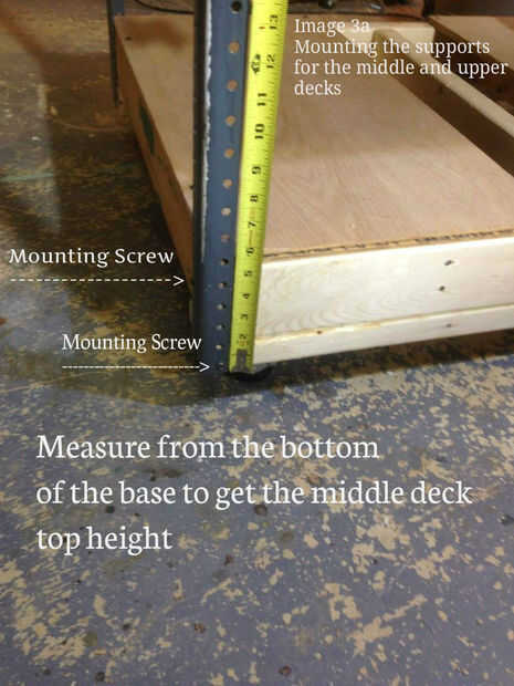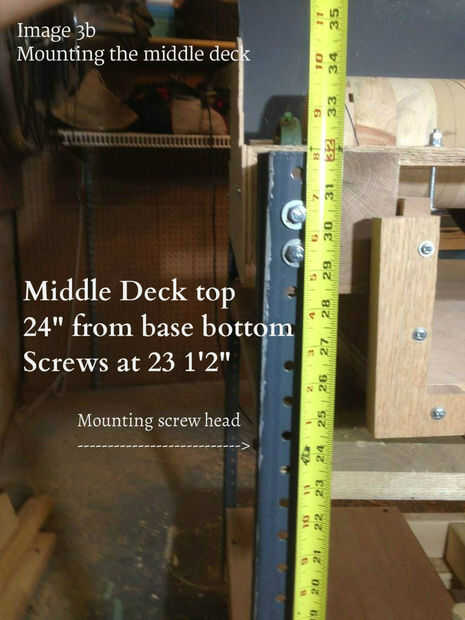 - Si se utiliza hierro de ángulo (re: Foto tomada de internet)-decidir sobre lo que será la parte superior e inferior de las piezas de hierro de ángulo. En la parte inferior de todas las 4 piezas, perforar 2 - uno de 1/2" hasta y el segundo sobre 4" desde la parte inferior en diferentes lados. Una vez que estos agujeros se perforan, luego medir 23 1/2" de la parte inferior del hierro de ángulo y haga otra serie de agujeros para apoyar la cubierta intermedia (ver imágenes 3, 3a, 3b). Estos agujeros deben taladrarse con un 3/16" poco y los 1 1/2" cabeza madera tornillos arandela para tornillo todo juntos.