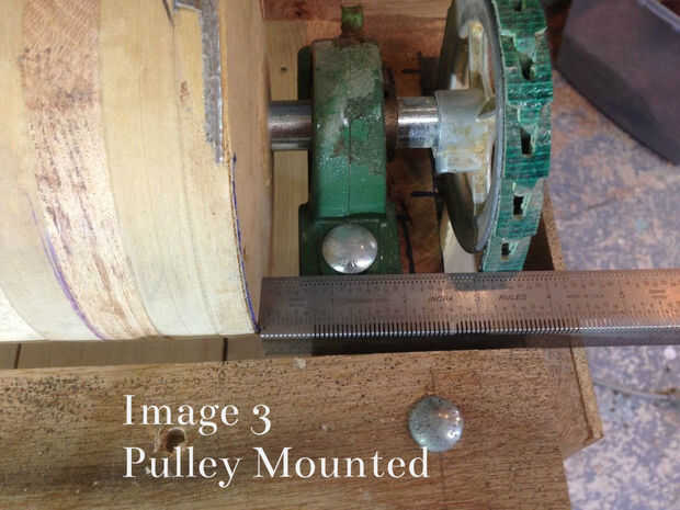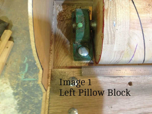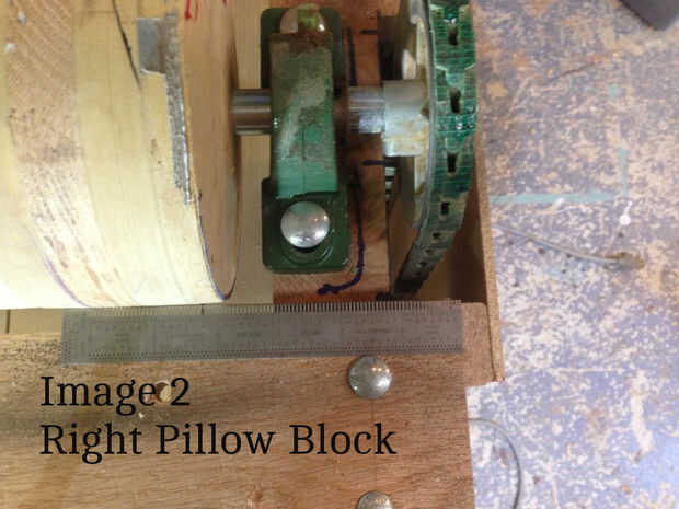 - Puse el lado izquierdo al ras con el eje (imagen 1) y luego con cuidado coloca el lado del bloque de almohadilla para ser paralelo a la viga de apoyo izquierdo. Entonces tomé 2 de los 1 1/2" tornillos para madera había estado usando, añade una arandela a cada uno y con cuidado los apretó hasta mantener el bloque de la almohadilla en su lugar.