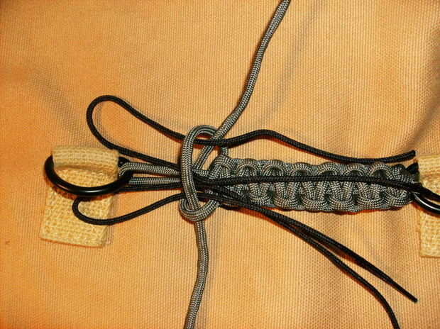 Medio las piezas dos de 12,5 pulgadas y coloque dentro el siguiente nudo. Ahora el truco para terminar para arriba es para atar el sinnet lo suficientemente ajustada para que se vea bien pero no tan fuerte que no podrás tirar los restos a través de.