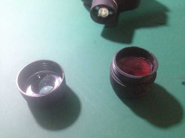 En primer lugar, colocar la pieza de plástico blanco de nuevo en la parte inferior de la cubierta de lente, seguido por el filtro rojo de eso, entonces atornille la parte superior de la lente trasera de la vivienda en.