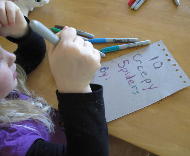 Hacer una portada llamativa para tu obra maestra. Mi hija quería llamar nuestra "10 arañas espeluznantes" aunque sus arañas fueron tan lindas que parecían incluso no podían lastimar a una mosca.
