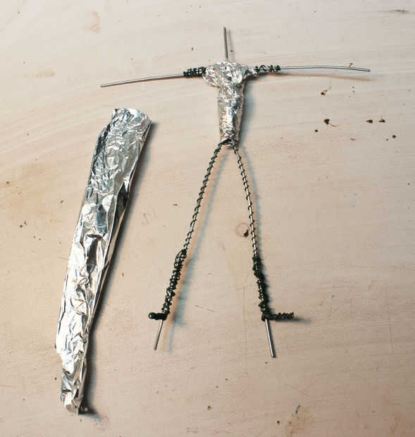 Comenzar a envolver tiras de papel de aluminio alrededor de las partes del cuerpo que requieren de carga. Por lo general envuelvo casi la totalidad de la armadura en el papel de aluminio porque he encontrado que la arcilla se pega mejor a él. Bulking ahorra en los costos de materiales de la arcilla.