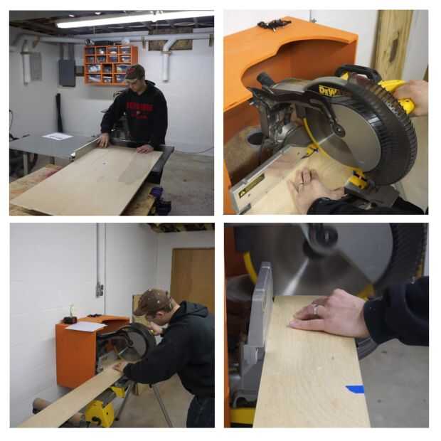Para la mayoría de las partes era capaz de cortar dos piezas de madera contrachapada de 1/2" a un poco más entonces que necesitaba, todo a la longitud en el inglete vio y luego cortar al ancho final, incluyendo el bisel sobre la mesa de sierra.