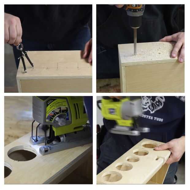 Dependiendo de las copas que usa el espaciado de los agujeros será diferente. A mano, he marcado los orificios perforados a partir agujero y cortar los círculos con una sierra de calar. Si iba a hacerlo otra vez sin duda utilizaría una broca Sierra de agujero pero no tengo uno a la vez. Utilizando la plantilla vio obras, pero una sierra hará limpiar los agujeros y las copas mucho más fáciles de montaje.