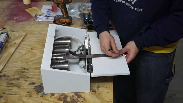 Había montado las vueltas a la puerta de la caja utilizando adhesivo de construcción.