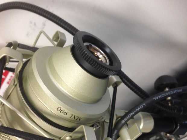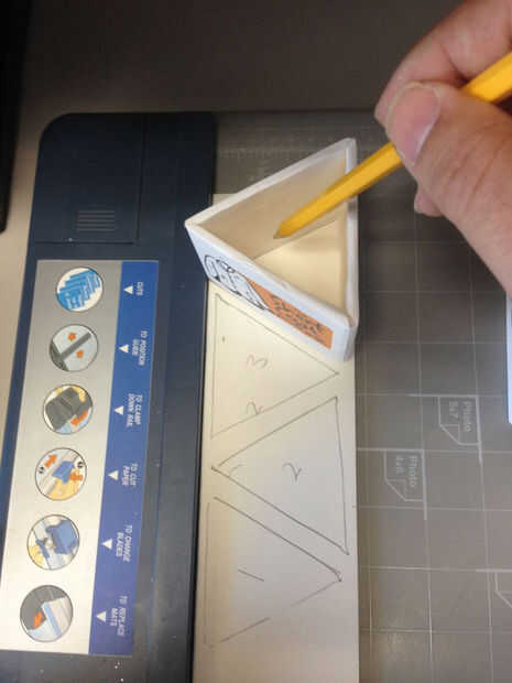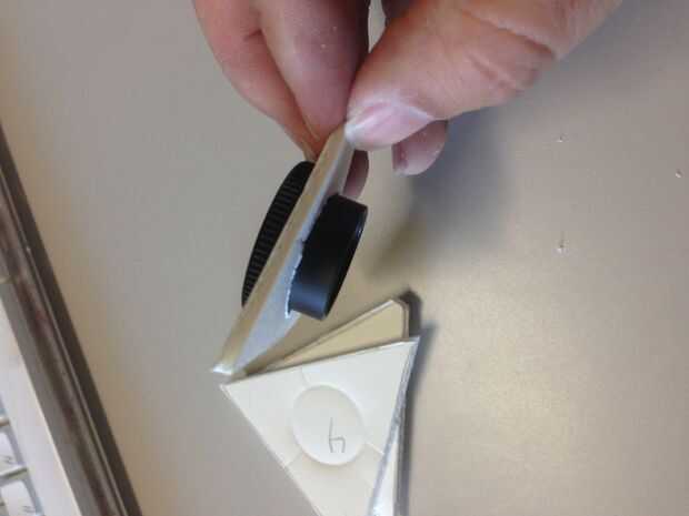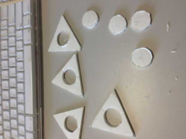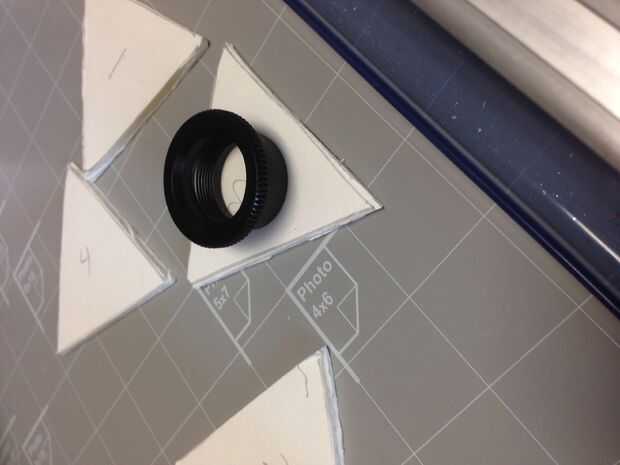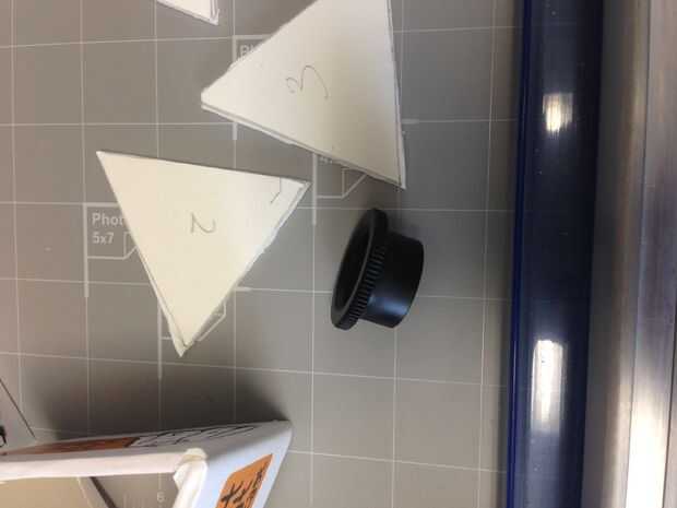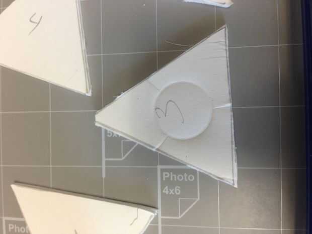 Hacer un círculo en el centro del triángulo. El diámetro del círculo ajusta el micrófono. En mi caso, usé un reborde que mi micrófono viene con los tornillos en la parte inferior del micrófono y se conecta el micrófono a un soporte (Foto 3, 4, 5) si el tuyo será un micrófono de mano, usted querrá un círculo igual a su diámetro (foto 6). Bien, cuando usted corte el círculo (foto 7) a objetivo para un ajuste de fricción (Foto 8).