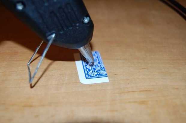 Una vez que han cortado el frontal y posterior de su unidad USB, conecte la pistola de pegamento, inserte un palillo del pegamento, y espere un minuto para dejarlo calentar. Coloque pegamento caliente (tenga cuidado, no coloque demasiado o demasiado poco) sobre la pieza de tarjeta utilizas para el frente. Lugar en el circuito de la impulsión del USB. Repetir la parte de atrás.