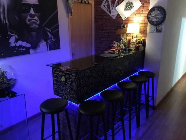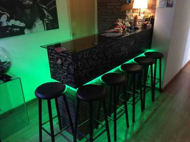 La etapa final es añadir luces LED a lo largo del labio de los estantes del negro. Me mide la parte superior y tenía una copa superior plumas plata permanentes a ajuste y usados para diseñar el nombre de la barra en la parte delantera. (Nota, un poco de diversión te dejo mis amigos muestra la barra de su visita)